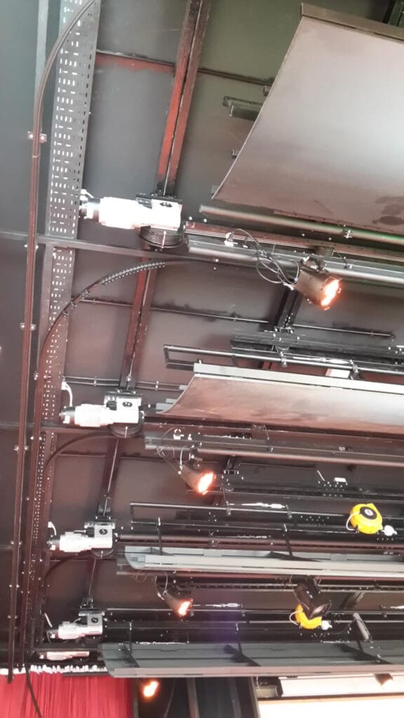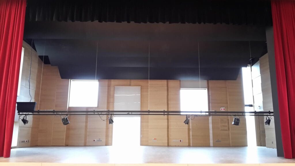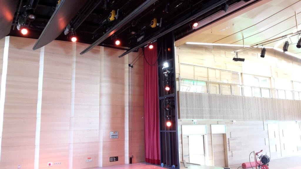 Planning, delivery and installation of a complete fixed stage system with electric theatre winches, steel structures, mechanical platforms with integrated bearing, acoustic panels, stage floor, curtains and control system.