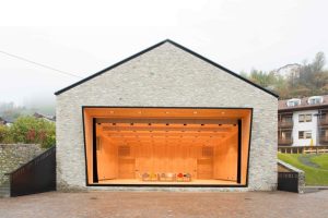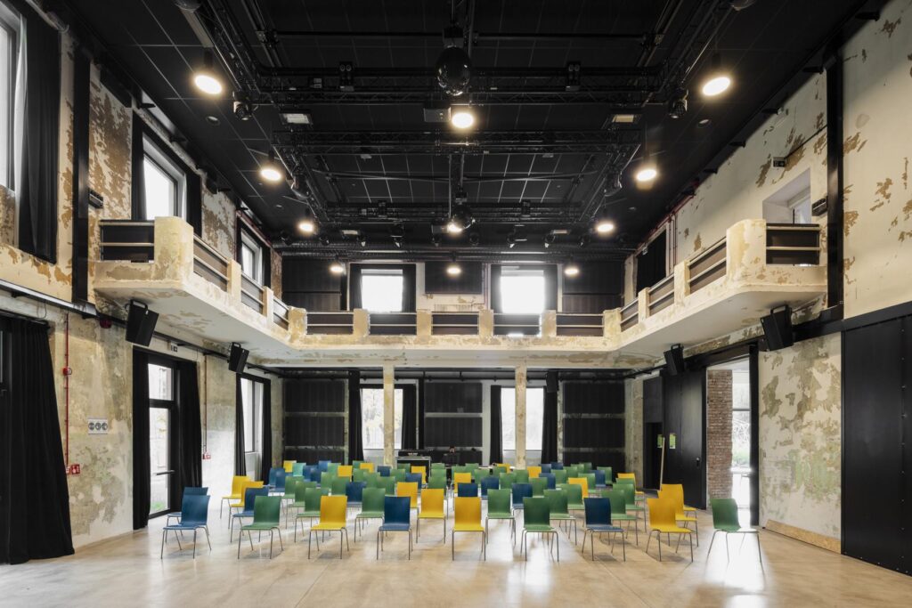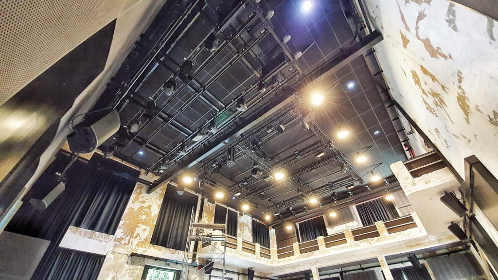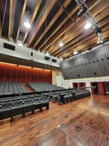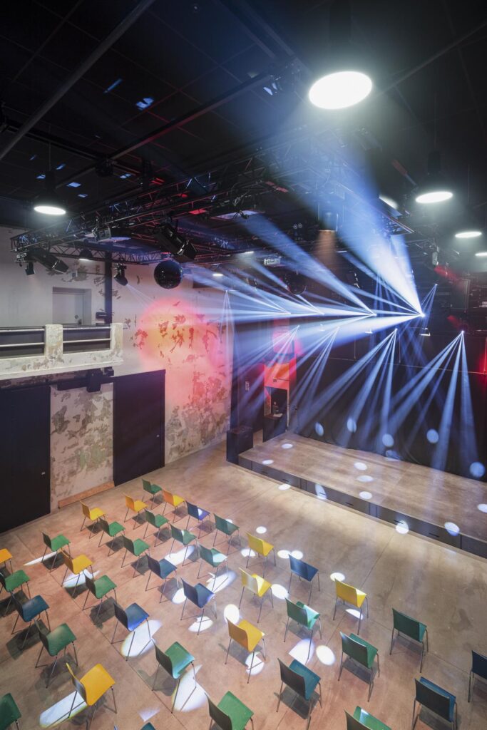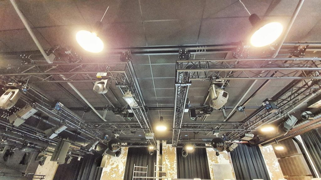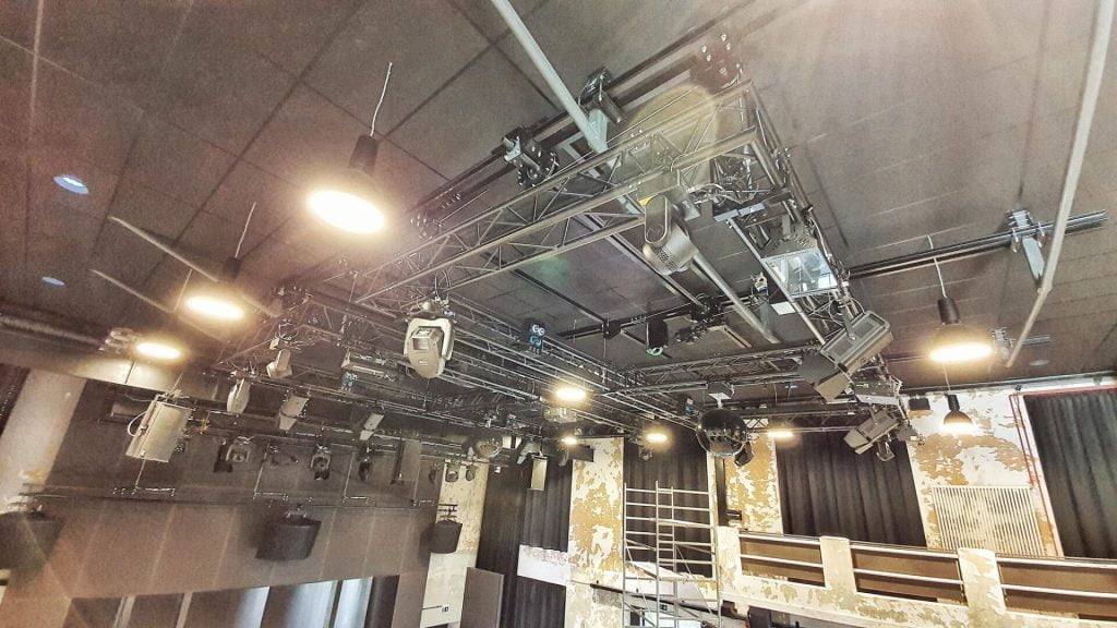 Design, delivery, and installation of a fully fixed stage system with theater winches and lighting trusses, aluminum truss structures, and a mechanical stage platform with integrated storage.