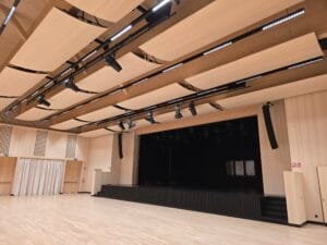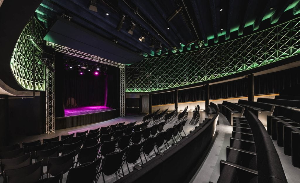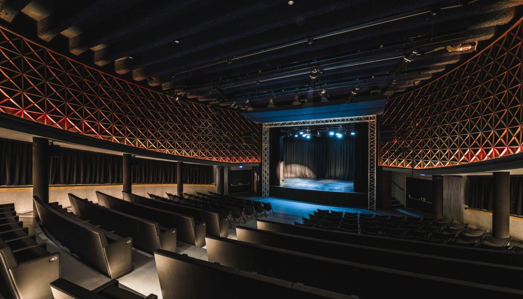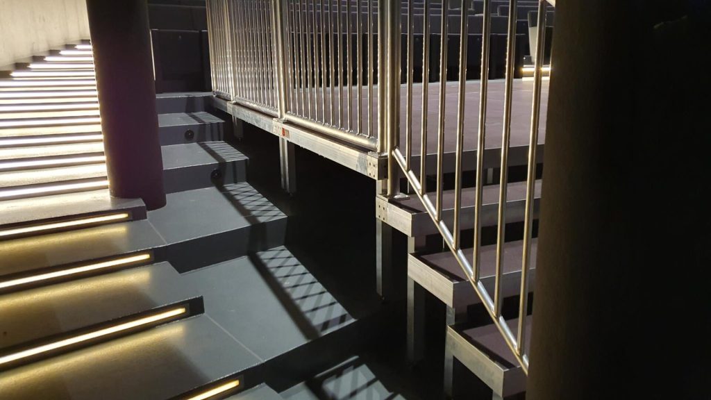 Planning, delivery, and installation of a complete fixed stage system with theater winches, stage floor, truss portal, and other elements. The control of the winches is carried out via a modern push-button panel.