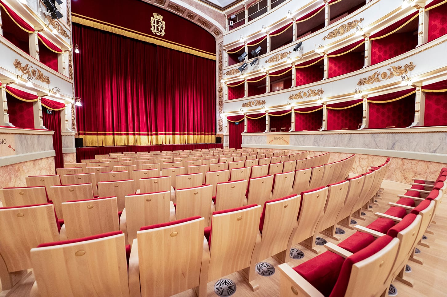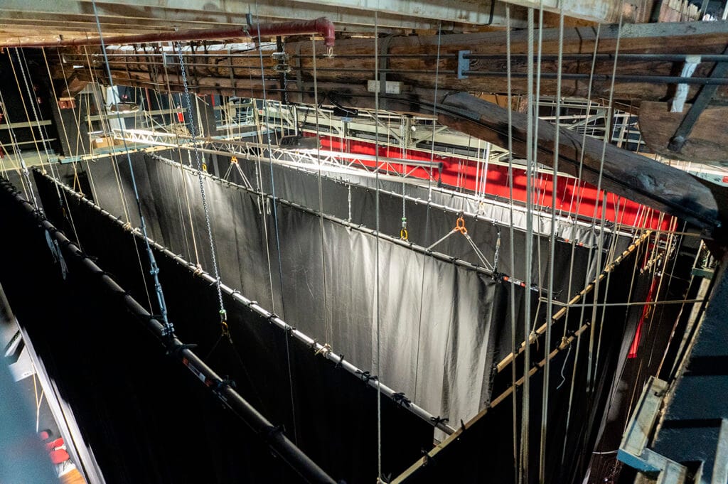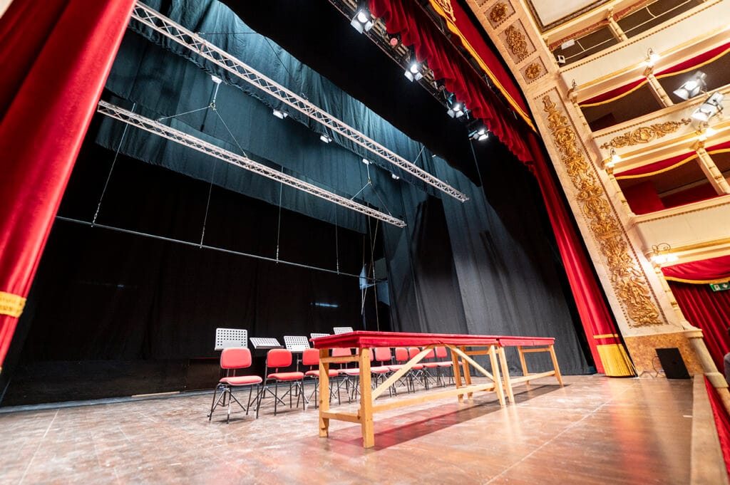 Suministro de un sistema completo de maquinaria escénica sobre parrilla de madera con tiros eléctricos de cable y polipastos de cadena. Suministro de un conjunto completo de patas y telones. Diseño y suministro del telón principal con bambalinón (Arlecchino) bordado. Suministro del suelo desmontable del foso de orquesta.