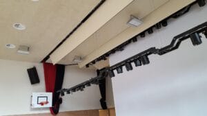 Planificación, entrega e instalación de un sistema completo de escenario fijo con tornos de teatro eléctricos, telones y sistema de control.