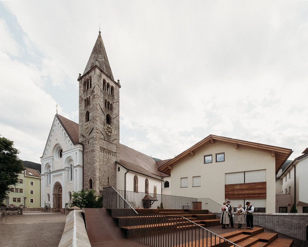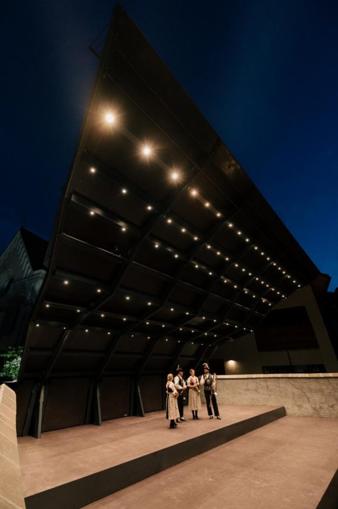 Planung, Lieferung und Montage einer modernen automatisierten Orchestermuschel für den Außenbereich mit integrierter Beleuchtung und Audioanlage. Im geschlossenen Zustand, bei abgesenktem Bühnendach, ist das Dach begehbar und formt eine Tribüne als Platzerweiterung. Im offenen Zustand wird der Bereich zur Bühne mit integrierter Beleuchtung und Abstufungen im Bühnenbereich. Der Antrieb erfolgt mechanisch. Es sind keine weiteren Stützen zum sicheren Halten des Daches erforderlich.