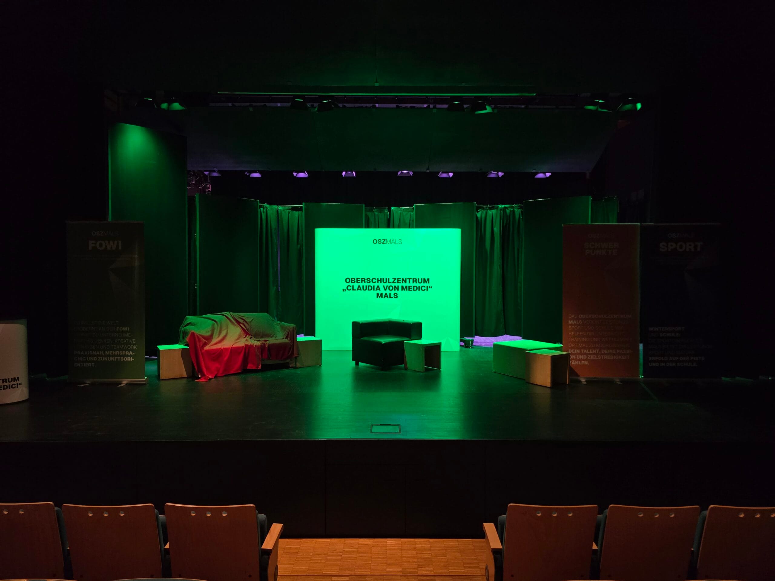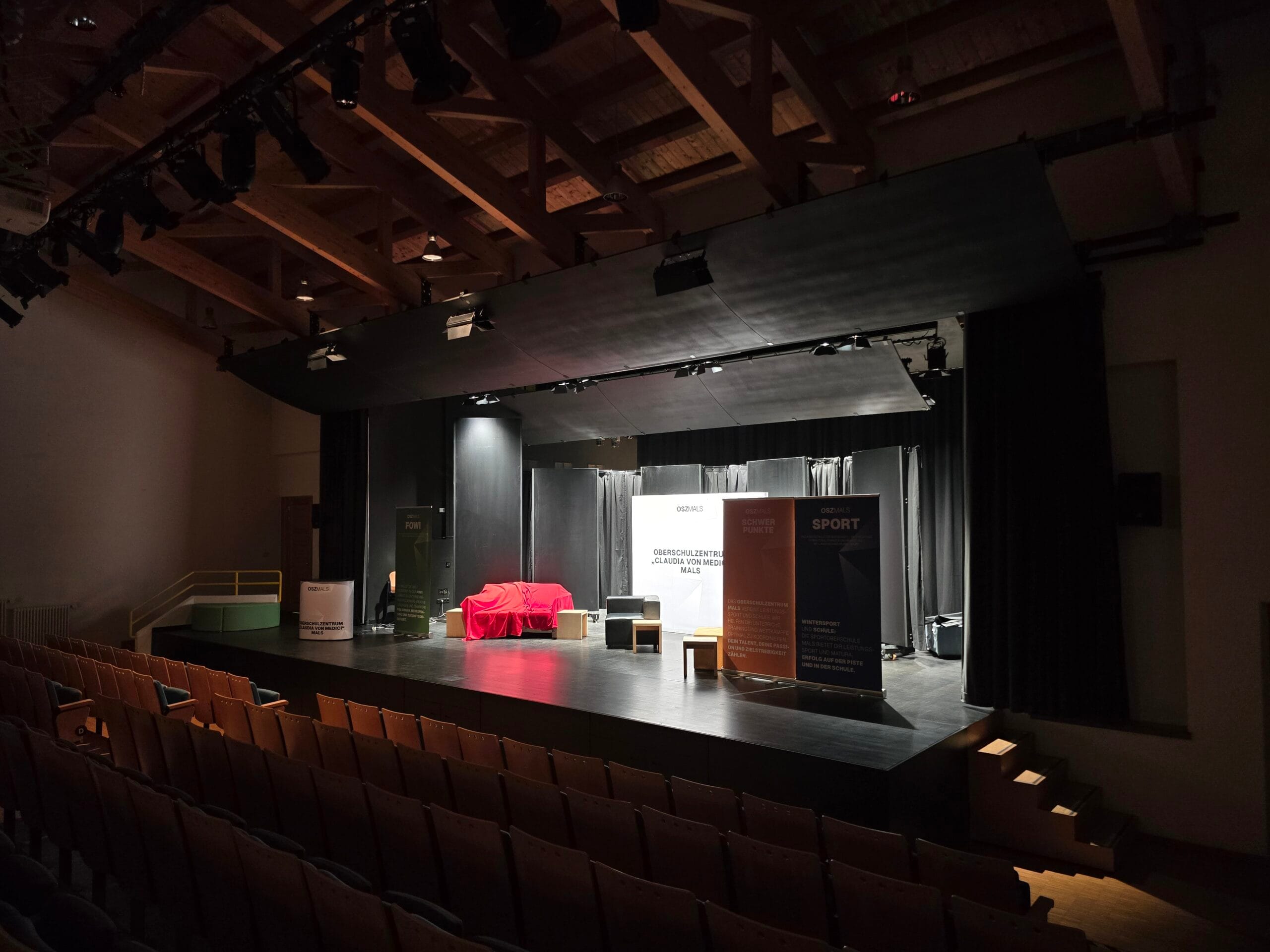 Planung, Lieferung und Montage einer kompletten fix installierten Bühnenanlage mit Theaterseilwinden, Bühnenboden, Bühnenverlängerungen, Bühnentreppe und weiteren Elementen. Ein elektrischer Saal-Beleuchtungszug verschwindet in der Decke mit angehängten Scheinwerfern. Mit geliefert wurde ein elektrischer Hauptvorhang als Bühnenvorhang.